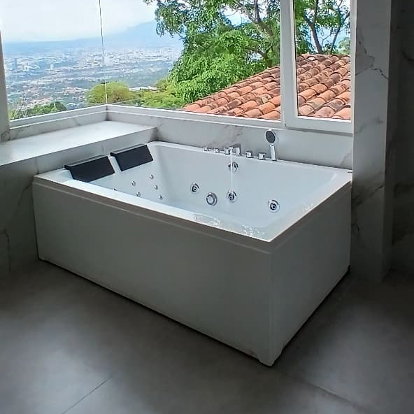 Equipamiento: Bañera hidromasaje 18 jets, bomba 1.5Hp 110V, almohadas (2), desagüe con rebalse, grifería